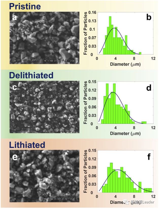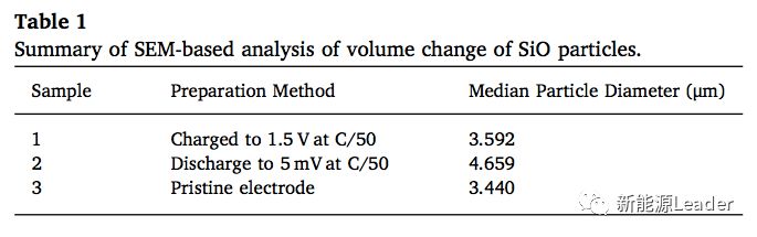 体积膨胀引起颗粒粉化和破碎,导致活性物质损失是硅负极材料循环性能较差的重要因素,为了对比Si和SiO两种材料的体积膨胀的差别,作者采用SEM手段分析了SiO材料在充放电过程中的体积变化(如下图所示),下表为SiO在充放电前后中粒径的变化。从分析结果来看,SiO材料在嵌锂态下相比于脱Li态体积膨胀118.2%,相比于Si材料高达280%的体积膨胀要小的多,这也减少了SiO材料在充放电过程中颗粒破碎和粉化的风险,因此显著提升了SiO材料在长期循环中的稳定性。