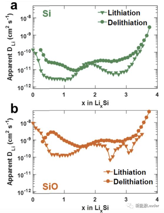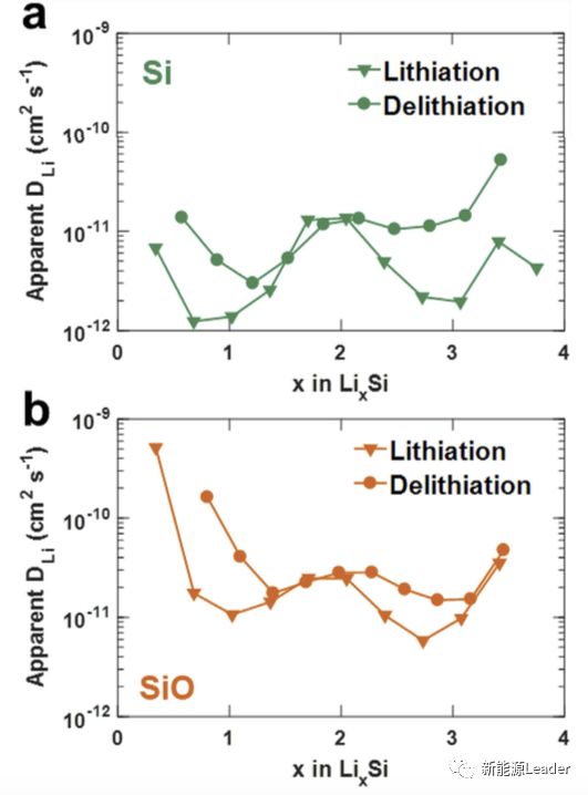 GITT方法也是测量Li+在活性物质中扩散系数的有效方法,为了验证上面EIS测试结果的准确性,作者还采用GITT方法对Si和SiO两种材料的Li+扩散系数进行了测量(结果如下图所示),可以看到Li+在Si材料中的扩散系数为10-9-10-12,而Li+在SiO中的扩散系数为10-8-10-11,Li+在SiO中的扩散系数要比在Si中高1到2个数量级,这与前面的测试结果是相一致的,较大的Li+扩散系数是SiO材料倍率性能好于Si材料的重要原因。