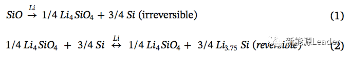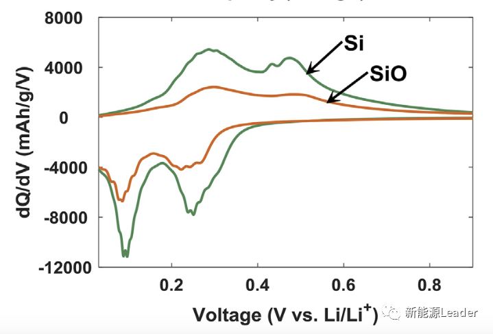 通常我们认为SiO的嵌锂反应分为两个部分(如下式所示),首先是SiO与Li不可逆反应生成Li4SiO4和Si,然后Si与Li进行可逆的嵌锂反应。从下图中的Si和SiO材料充放电过程中的dQ/dV曲线能够看到,SiO和Si材料充放电过程中具有完全一致的氧化还原峰,这也表明SiO材料中真正具有电化学活性的成分是在首次充电过程中产生的单质Si。