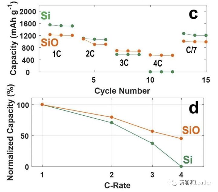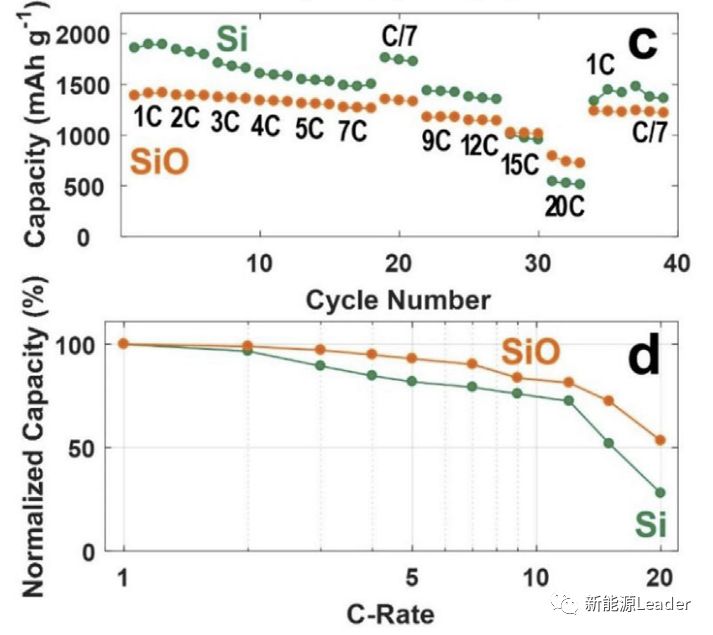 倍率性能在动力电池应用中也是一项非常关键的性能,直接关系到锂离子电池的输出性能,下图为Si和SiO材料在不同的放电倍率下的容量(下图c)和容量保持率(下图d),从下图d中我们能够清楚的看到,SiO材料的放电倍率性能要显著好于Si材料。