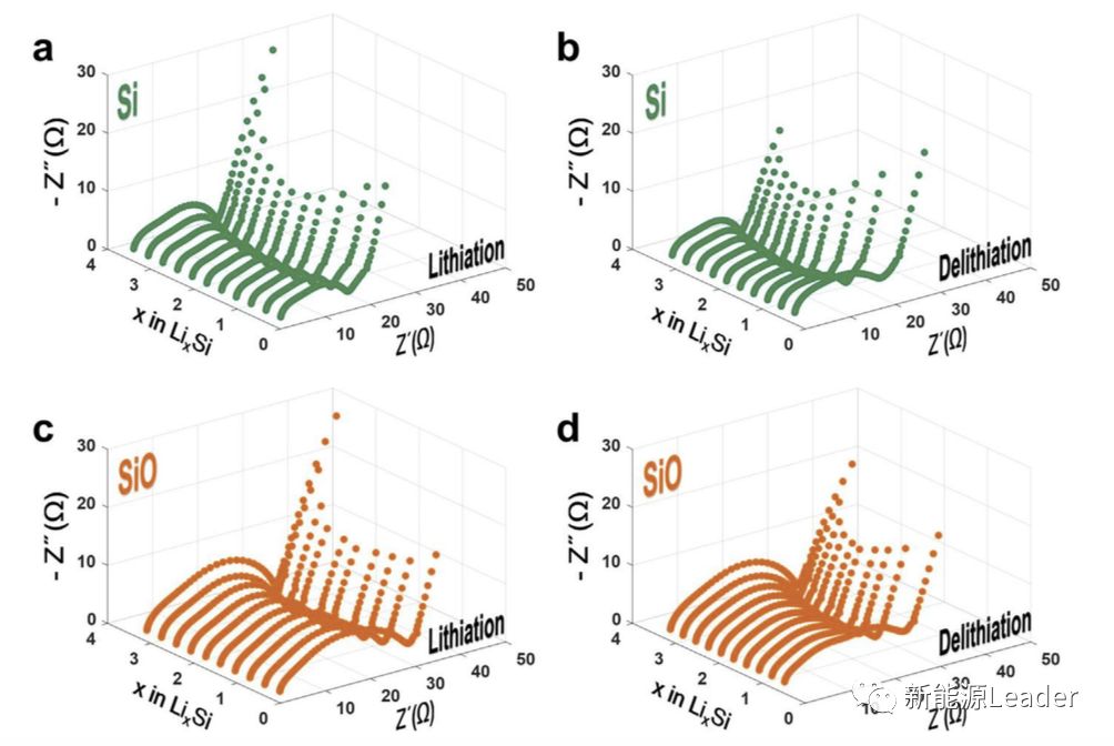 上图为Si和SiO材料在不同的SoC状态下的EIS曲线,下图为根据EIS曲线和上述的公式计算得到的Li+扩撒系数,从图中能够看到Si材料中的Li+扩散系数为10-11-10-12cm2/s,而SiO中Li+的扩散系数可达10-9-10-11cm2/s, Li+在SiO中的扩散系数要比在Si中高1到2个数量级,作者认为这主要是因为SiO材料在首次充电过程中生成的Li4SiO4材料是一种Li+导体,因此加速了Li+的扩散。