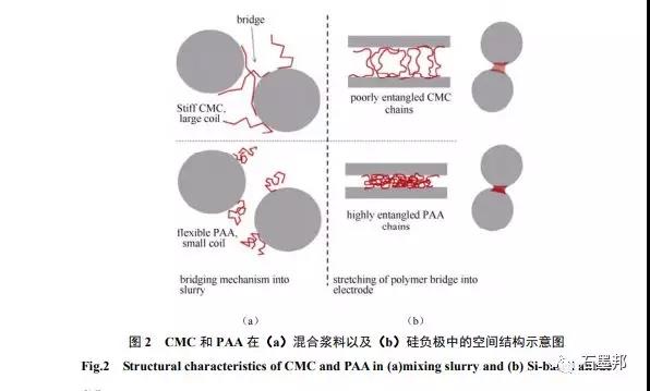 KARKAR 等对比研究了CMC和PAA作为Si纳米颗粒负极黏结剂的性能差别,如图2所示,在Si负极浆料中由于CMC黏结剂中D-吡喃式葡萄糖酐的结构非常稳定,造成链区长度较长,因此,结构刚性较强,虽然能够将即使相隔较远的硅基活性材料颗粒紧密黏结在一起,但是不能适应硅基负极材料的体积变化,而PAA黏结剂中聚乙烯的主链结构柔性较强,支链中含有丰富的—COOH基团使得其更容易通过分子间的氢键作用力形成相互纠缠结构,造成链区长度较短,但是这种高度纠缠的结构不仅能够提高硅基负极活性材料间的粘结强度,同时也能更加适应硅基负极的体积变化。由此可见,CMC和PAA作为Si负极黏结剂时从分子结构上看各有优缺点,当硅粉负极体积膨胀明显时,PAA黏结剂可能会表现出更加优异的循环性能。