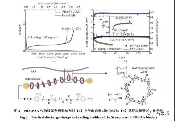CHOI等在PAA黏结剂中加入多聚轮烷,通过酯键相互交联聚合得到具有特殊结构的“分子滑轮”型双组分PR-PAA黏结剂,如图3所示,“分子滑轮”型结构的特点是黏弹性很高,其中PAA部分具有较强的黏结性能,而串联在PAA主链上的轮环分子具有独特的自由滑动性能,使黏结剂弹性得到大幅提高,可释放由于硅负极的体积膨胀收缩产生的应力,极大地提高了Si纳米颗粒负极结构稳定性,使用PR-PAA黏结剂的SiMP电极充放电首次效率可达91.22%,0.2C循环150 周容量没有明显衰减。