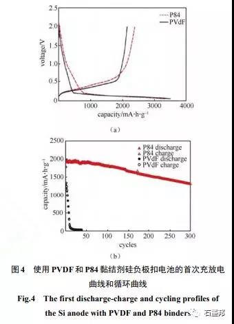 CHOI等利用3,3,4,4-二苯甲酮四羧酸二酐(BTDA),80%甲苯二异氰酸酯(TDI)和20%亚甲基二苯基二异氰酸酯的配位(MDI)共聚合得到聚酰亚胺类黏结剂P84。如图4所示,相比传统的PVDF黏结剂,使用质量分数为20%的P84黏结剂的Si负极扣电池的首次充电容量和首次效率更高,分别为2392 mA·h/g 和71.2%,且在1.2 A/g电流密度下循环300周后克容量仍然保持有1313 mA·h/g。P84较好的电化学性能来自于两方面:一是P84能在0.3V左右被硅基负极还原,还原产物有利于保持硅基负极材料的稳定性;二是P84的黏结强度要远高于PVDF,能够始终保持硅基活性材料之间或与集流体的紧密连接。