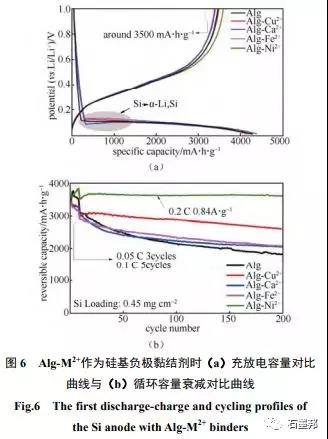 如图6所示,质量分数为15%的Alg 用作硅纳米颗粒负极黏结剂时扣电池的首次充电容量约3500 mA·h/g,在各种 Alg-M2+黏结剂中Alg-Ni2+黏结剂能够更明显地提升硅负极的充放电效率和循环性能,循环200周容量保持率高达99.2%,展现了海藻酸钠类黏结剂在硅基负极上巨大的应用潜力。