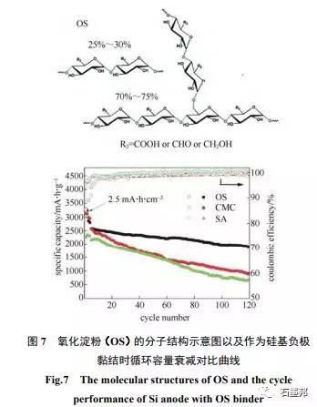 BIE等研究由25%~30%直链淀粉和70%~ 75%支链淀粉组成的氧化淀粉作为硅基负极黏结剂时对其电化学性能的影响。如图7所示,由于OS的分子结构中含有大量的支链结构并且每个D-葡萄糖上都含有大量的含氧官能团,保障了黏结剂分子与硅基负极表面的紧密黏结剂力,与此同时线性的主链结构中各聚合单元之间主要通过-(1-4)的连接方式形成螺旋式的主链结构,结构柔性很强,能够适应硅基负极在循环过程中的巨大体积膨胀变化,因此,相比其它CMC或SA黏结剂,能够表现出更优异的循环等电化学性能,使用OS黏结剂后的Si负极首次充放电效率和可逆容量分别高达85.1%和3295 mA·h/g,循环120周后容量保持率在74%以上。