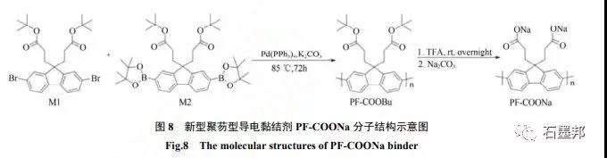 除了以上几种典型的新型硅基负极黏结剂以外,一些天然聚合物和复合结构聚合物等新型硅基负极黏结剂也在不断开发研究中。如图8所示,LIU等制备出了新型聚芴型导电黏结剂聚[3,3’-(9H笏-9,9-二丙酸)钠],记作PF-COONa,其中聚笏型的主链结构具有较高的电子电导率,而丰富的支链羧基官能团可以与硅基表面的含氧官能团形成化学键连接,因此具有较强的黏结性能。即使当Si活性材料的电极面密度提升至0.61 mg/cm2 ,含有33.3%的PF-COONa黏结剂且不使用任何导电添加剂的Si电极表现出高达2521 mA·h/g的可逆容量,在420 mA·h/g 电流密度下循环100周容量保持率可达 84%。
