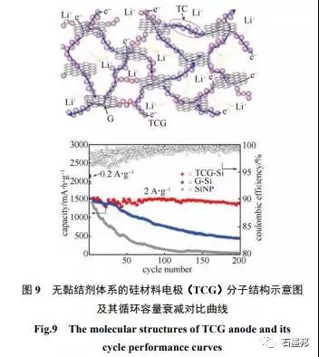 如图9所示,ZHOU等利用真空抽滤和热处理方法制备了具有特殊结构的无黏结剂体系的硅材料电极(TCG),其中硅纳米颗粒通过模板碳材料相互桥连,然后再与层状的石墨烯材料复合,同时形成了快速的电子和离子迁移通道,更有利于搭建高面密度和高压实特性的电极结构,实验证明该硅纳米颗粒负极扣电池在2A/g的充放电电流密度下质量比容量可达1390 mA·h/g,体积比容量可达 1807 mA·h/cm3 ,循环200周后容量保持率95%,且倍率性能优异,即使在8A/g的大电流密度下材料克容量仍然可达900 mA·h/g。